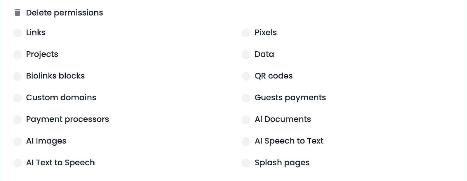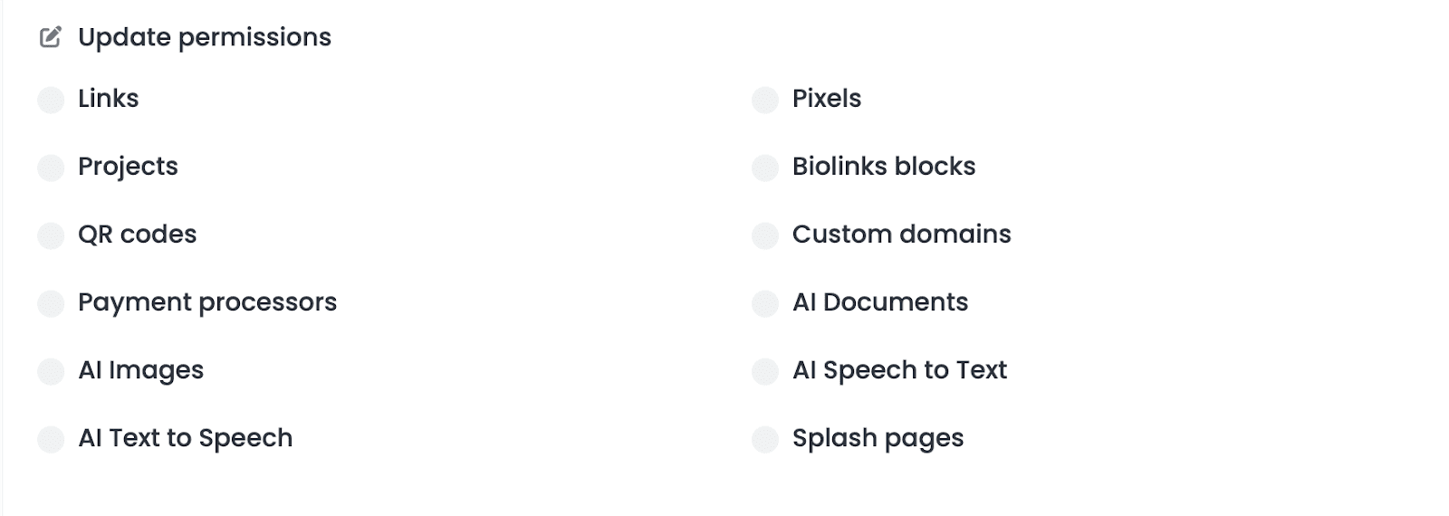 The Create permissions refer to which kinds of content they will be able to generate. Will they be able to create QR Codes? AI Documents? Payment Processors? Select all that apply.