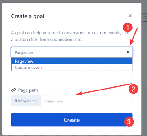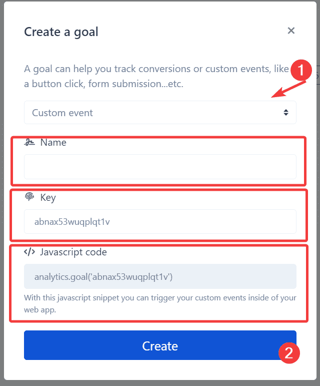 Custom goals will require some extra code implemented to the tracked website, which is specified when you create a new goal from the dashboard. A custom goal is mainly used for when you want to track a specific event that happens on your website, which can’t be tracked with the pageview method. Some examples of custom goals include:
