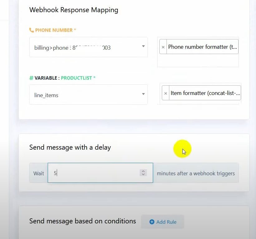 Set Message Delay and Conditions: Set a delay of 5 minutes for sending the message after the order is placed.