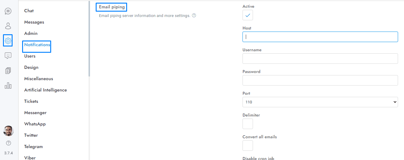 To activate the email piping go to Settings > Notifications > Email piping and enter your POP3/IMAP email server information, then set the email address to use for the email piping in Settings > Notifications > SMTP and you’re done! The email address must be the one to which the email piping server connects to. Chat will send all emails from this email address and you, your agents, and your users will reply to this email address.