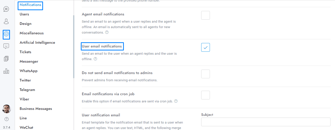 - When agents reply in Chat, emails are always sent to the user, even if user email notifications are disabled.