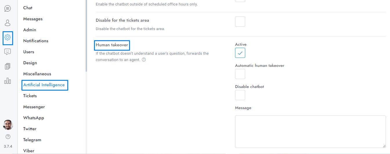 - If you’re using the Artificial Intelligence app, and the settings Settings > Artificial Intelligence > Human takeover is active, no emails are sent if the chatbot knows the answer.