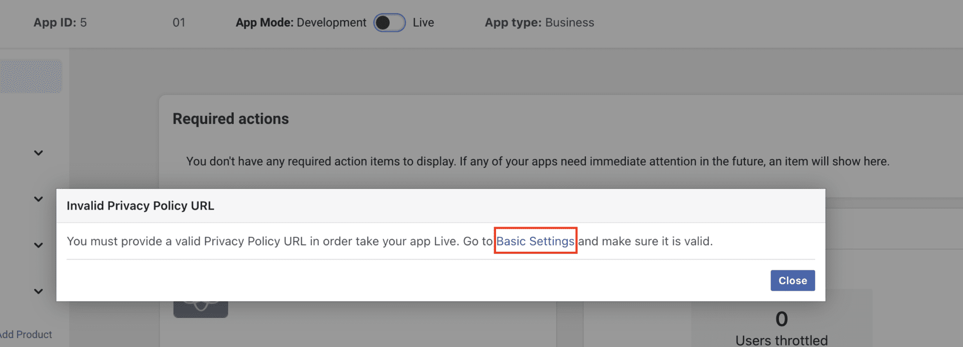 Toggle the switch from Development to Live. You will be prompted to link a Terms and Conditions and a Privacy Policy page. You can use ours: