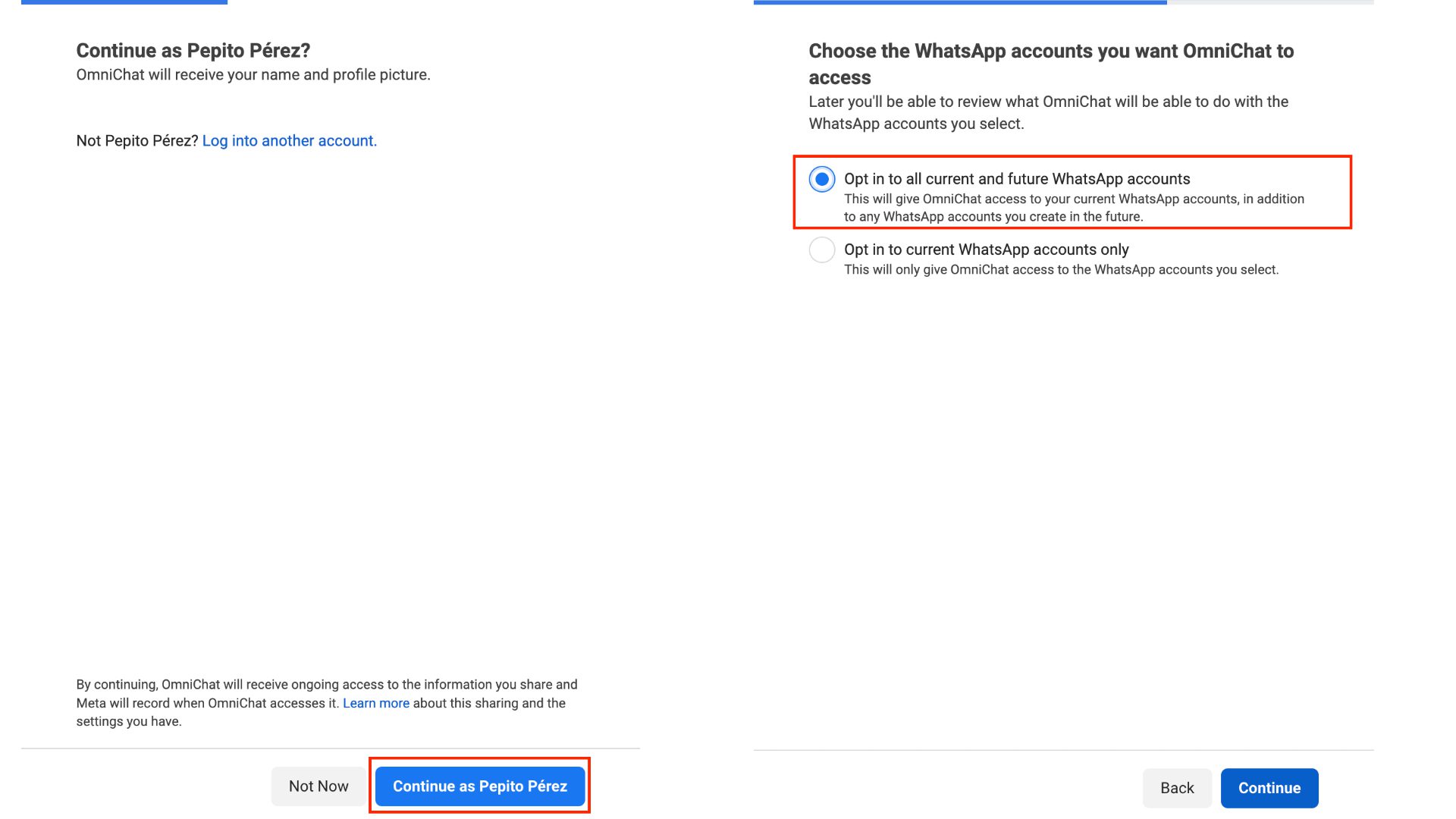 On the page that opens, click Continue As, then select Opt in to all current and future WhatsApp accounts. Click Continue and then Save. Skipping this step is most likely what keeps your account in Pending if you have connected it to our app already.