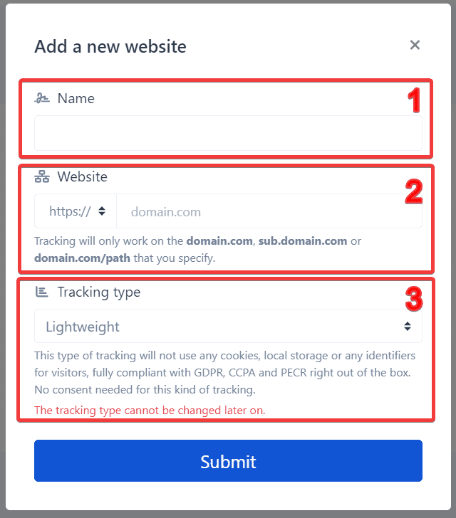 4.- Fill in the Website field with your website domain, subdomain or domain path. Example: domain.com, subdomain.domain.com, domain.com/path