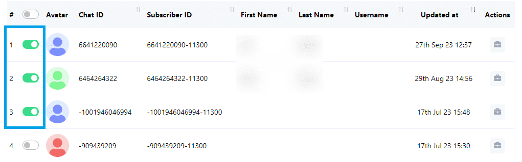 - In the list of subscribers, toggle the subscribers you want to assign to a label. You can select one or multiple subscribers for assignment.