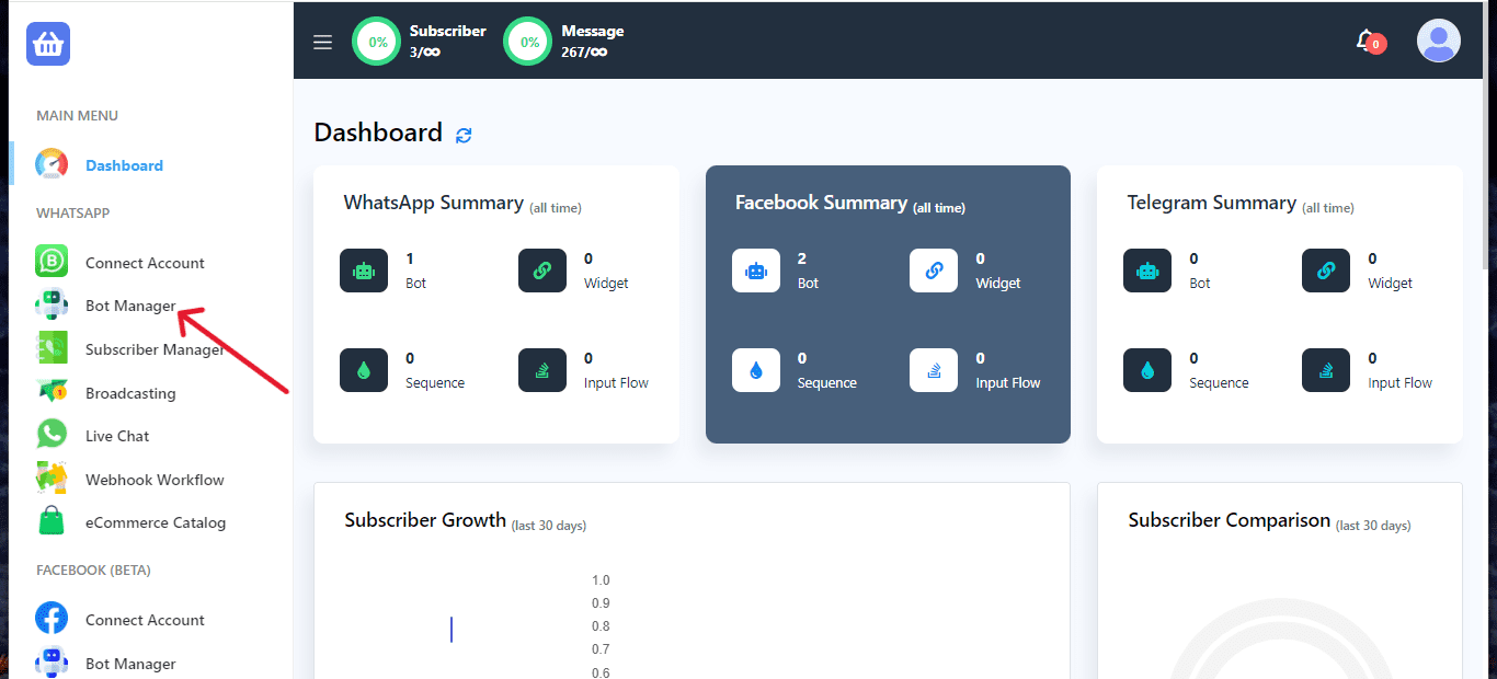Begin by navigating to the dashboard of this app and access the Bot Manager section.