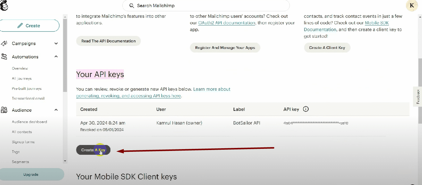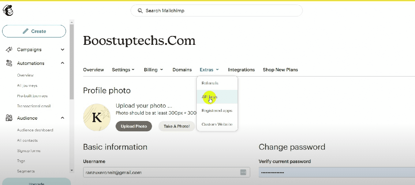 You will need the API key from Mailchimp. Go to your Mailchimp account and from the dashboard, go to your profile and click on “API keys”.