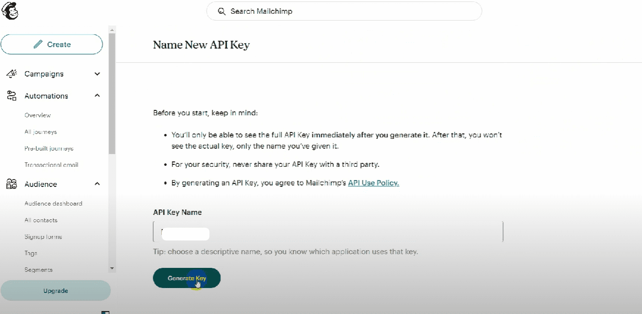Create a new API key by providing a name and clicking on “Generate key”.