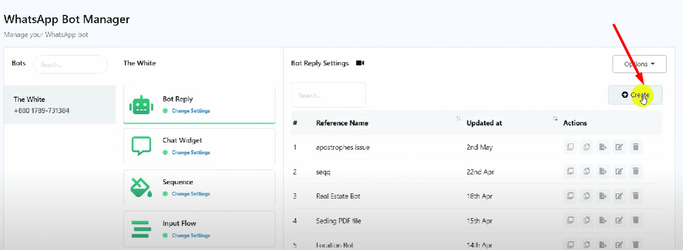Go to the bot reply section and click on “Create”.