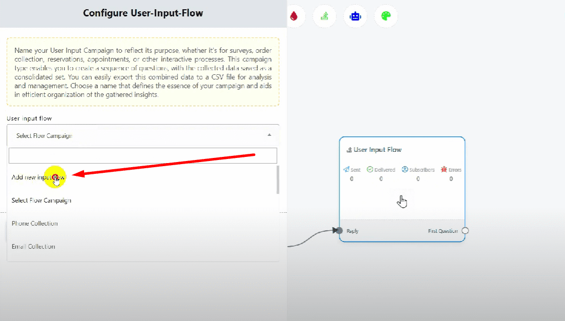 Drag a connector from the compose next message and leave the cursor. Select the user input flow, double-click on it, and select “Add a new flow”.