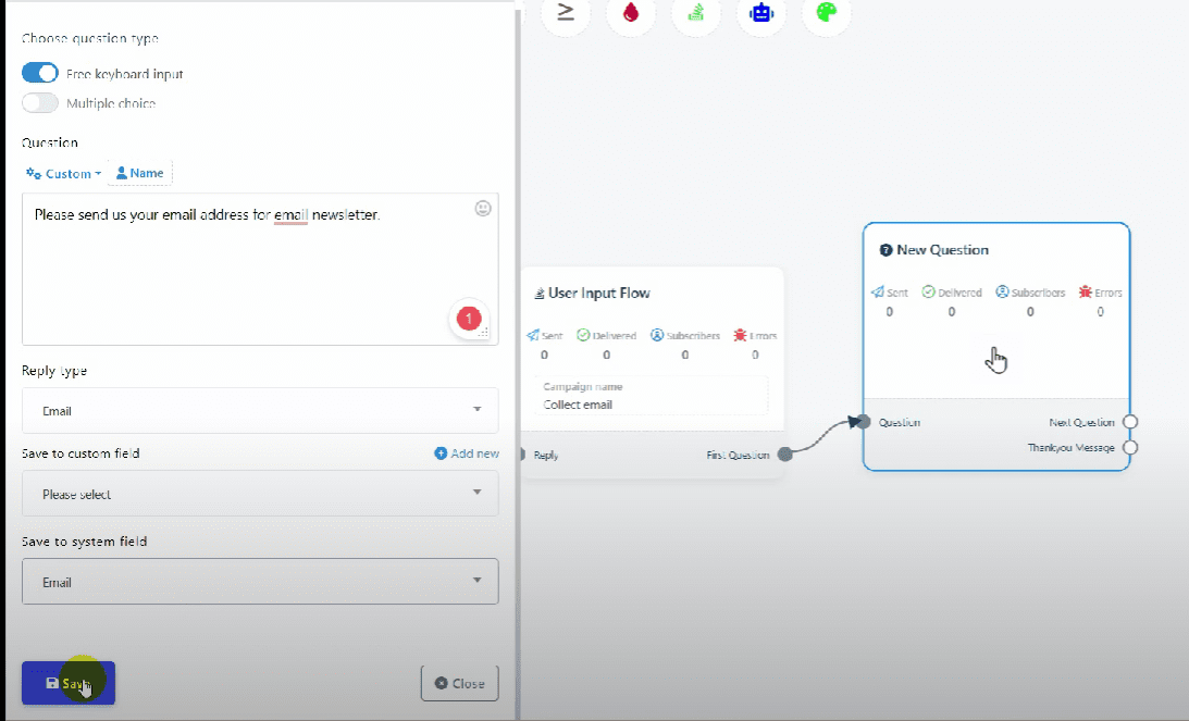 Add the question to ask for the user’s email address and select the reply type as “Email”. This is crucial to ensure the email is saved to the email autoresponder.