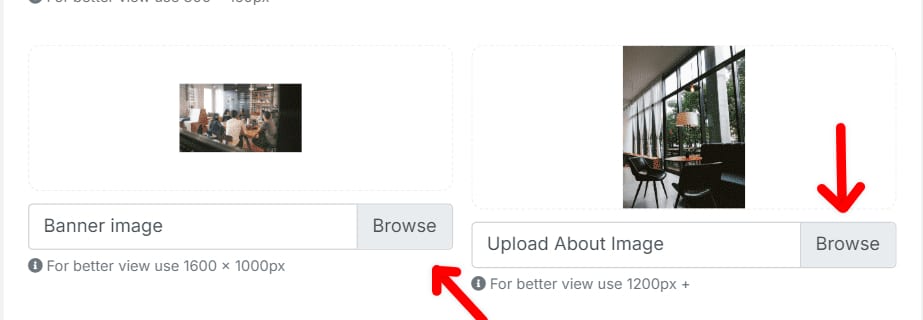 The “About” image provides a visual representation of information about your company. Click on the section to upload the “About” image and select the appropriate file from your computer.
