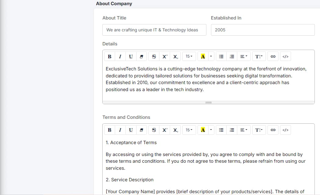Company Details: Add relevant information about your company, including the year of establishment, terms and conditions, and privacy policies. Enter the details in the provided fields. Include the company’s history, applicable terms and conditions, and relevant privacy policies.