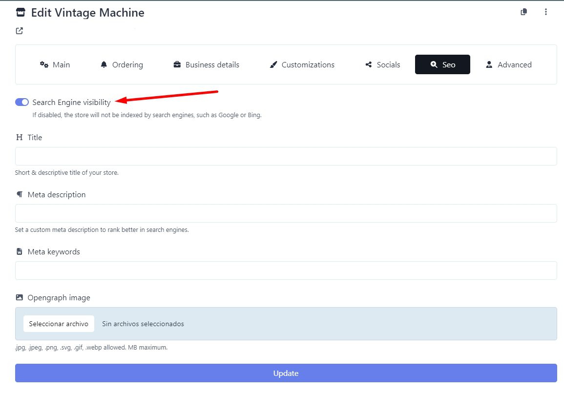4.- Customize the SEO Settings. Activate “Visibility in Search Engines” to allow your store to be indexed by search engines. In the “Title” field, add the name of your store to appear as the main title in search results.