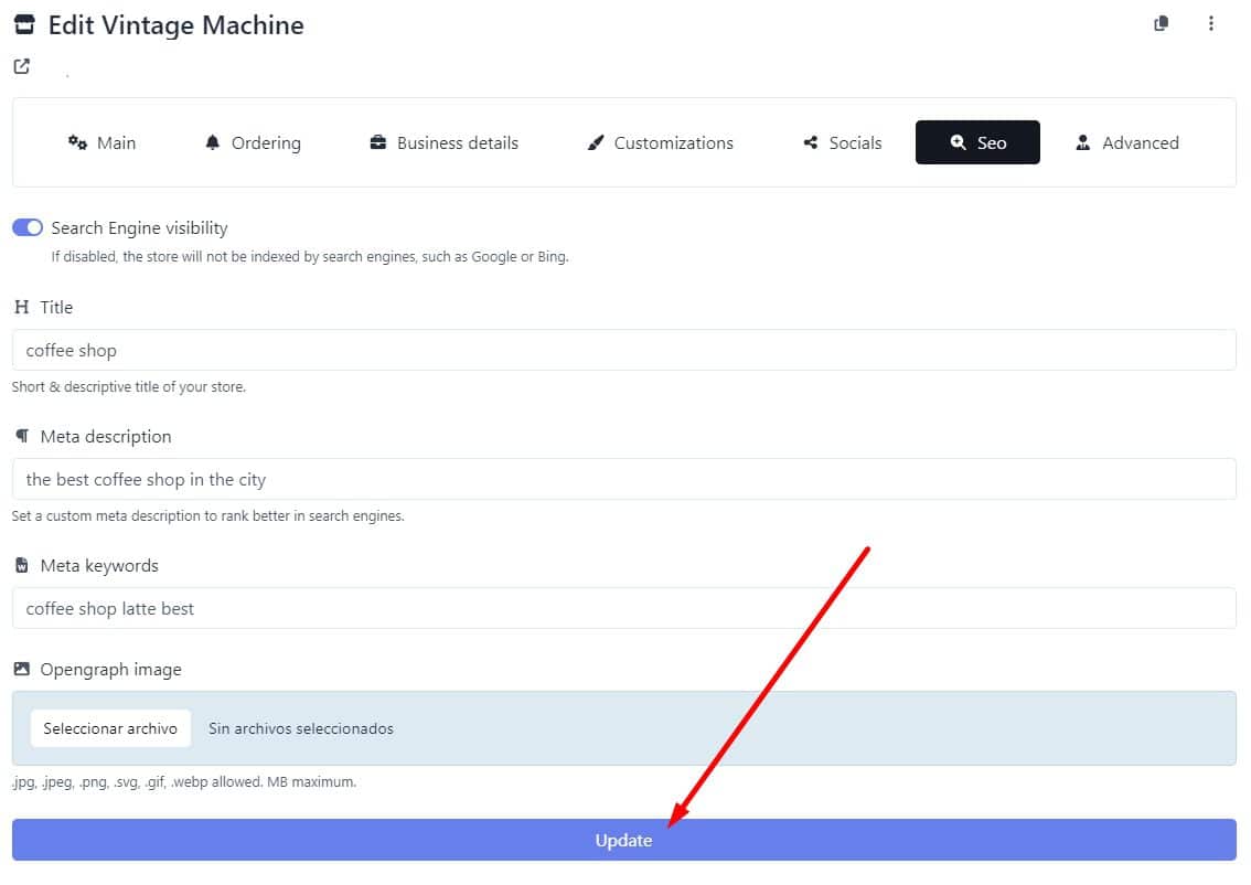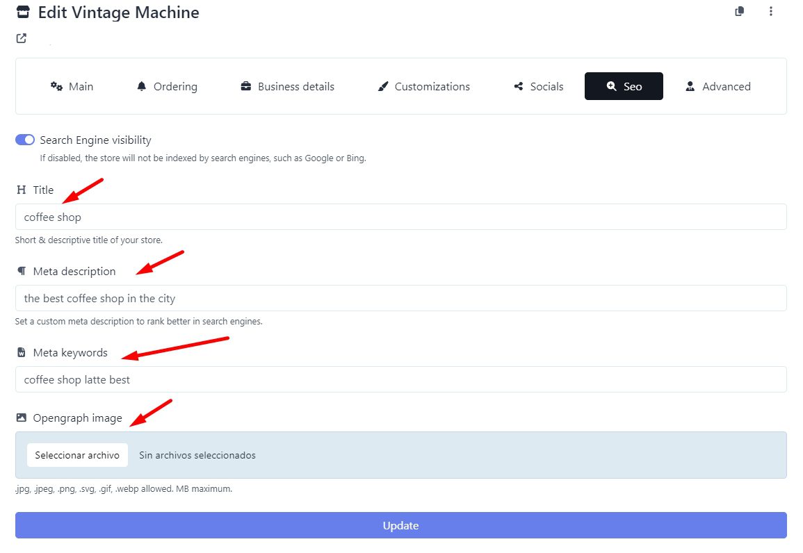 Provide a brief description of your store, using relevant keywords to improve search engine ranking. Make sure to include the necessary keywords to identify your page in search engines. Finally, add an image that represents your store and is attractive to your users.