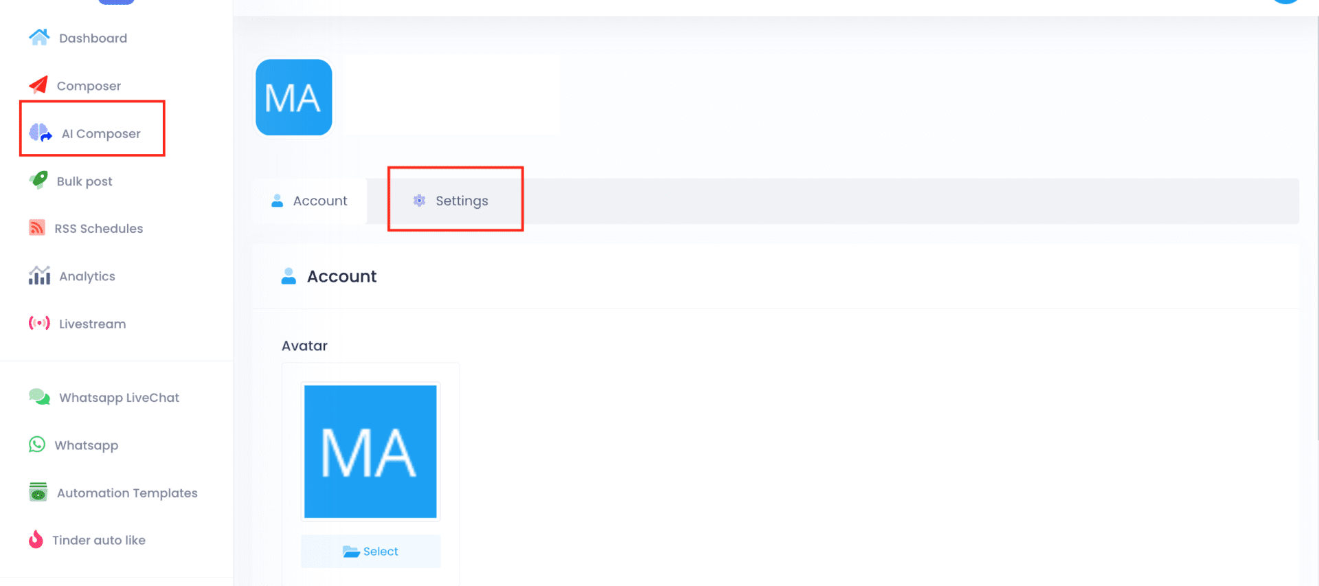 Open the app. Click on ‘AI Composer’ in the left sidebar. Go to Settings.