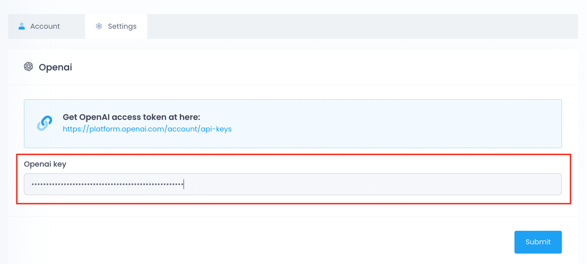 Paste the OpenAI API key in the corresponding field. Click on ‘Update’ to save.