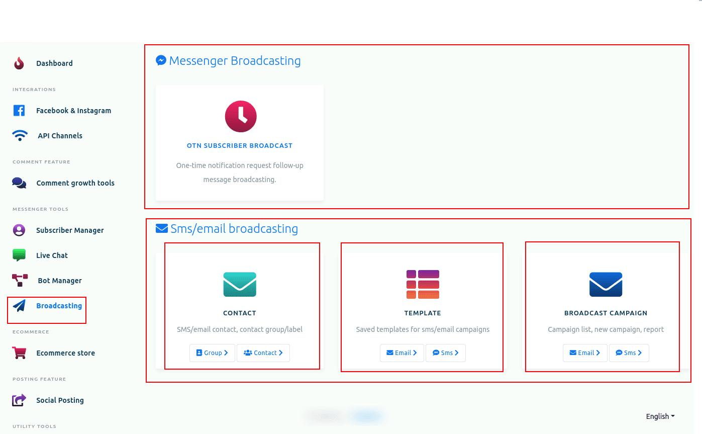 1.- Create a Messenger campaign. Open your dashboard and click on the menu called Broadcasting at the left-sidebar. You will open a page divided into two sections – Messenger Broadcasting and SMS/email Broadcasting. To create a campaign for Messenger Broadcasting, click on the Messenger Broadcasting option.