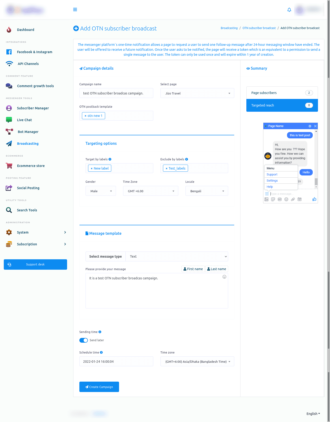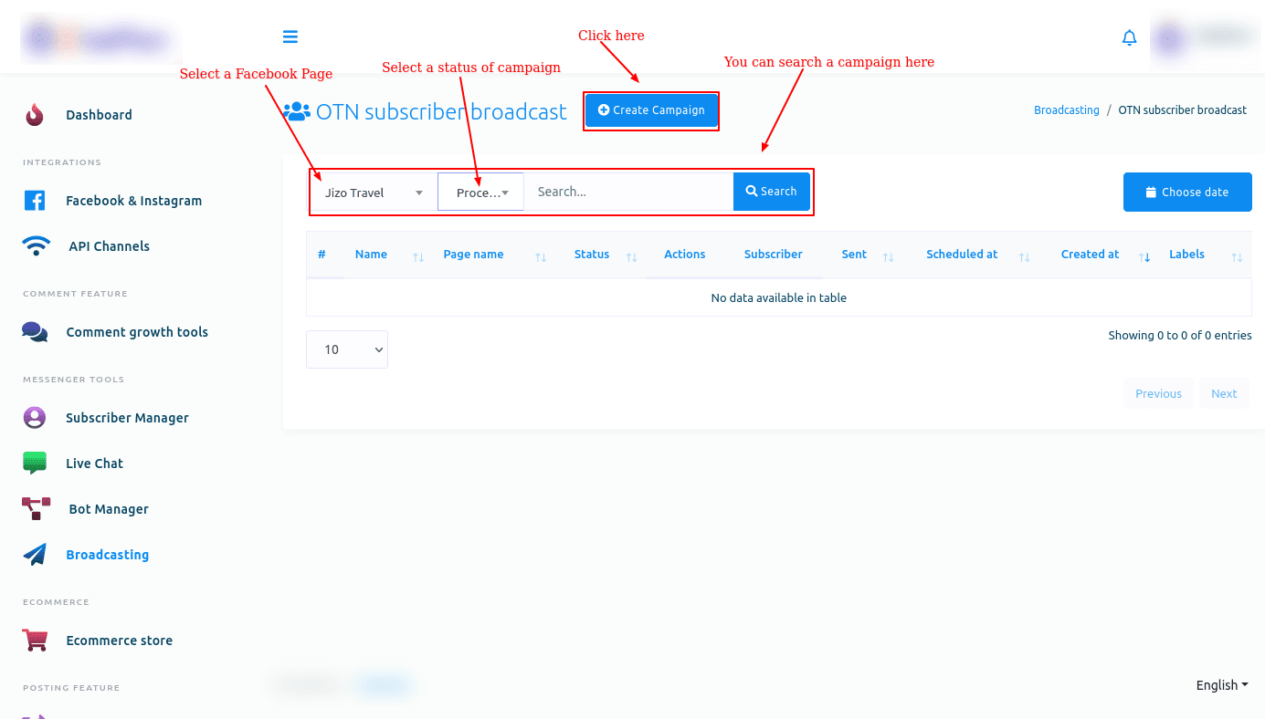 The broadcasting feature in our app facilitates enhanced communication across Messenger, SMS, and Email platforms, fostering stronger connections with subscribers and contributing to effective customer engagement. Here, we will see how to use this feature on Facebook Messenger.