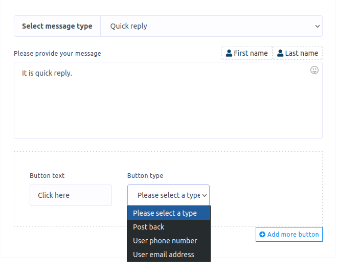 On the other hand, if you select quick reply, some fields – message, button text, button type – will appear. Write a text message in the message field. Type a text for the button on the button text field. Select a button type in the button type field. Click on the button type field and a drop-down menu of different button types – Post Back, User phone number, User email address – will appear.
