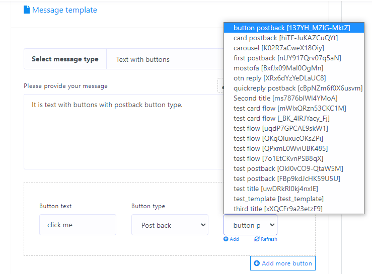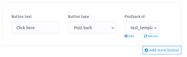 If you select postback, another field called postback id will appear. In the postback id field, you have to select a pre-defined postback template. You can also create a postback id by clicking on the add button. You can also add more buttons by clicking on the add more button.