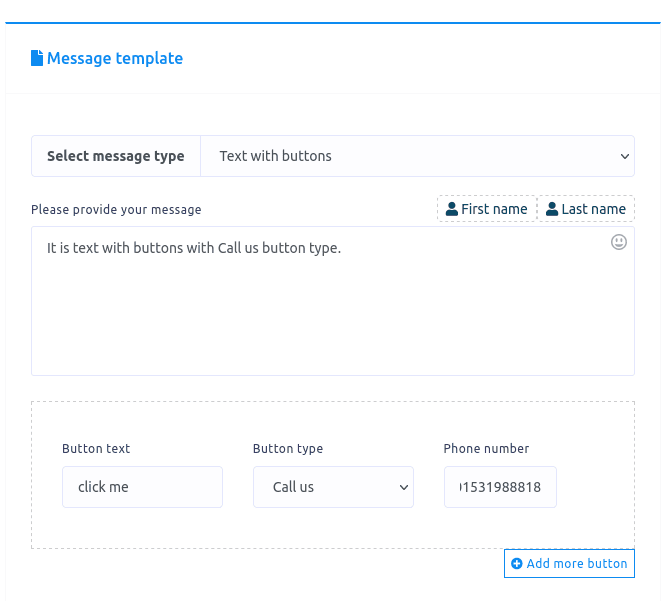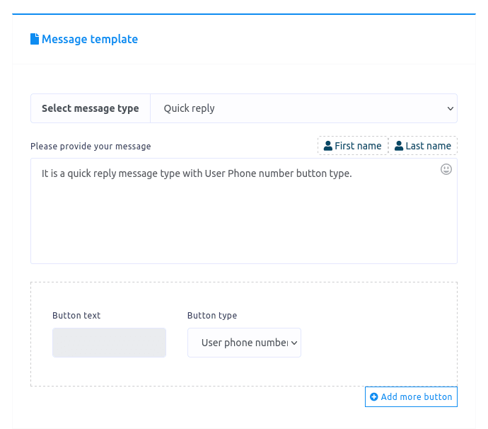 In the quick reply message type, you can select the user phone number as the button type. Just as you select the User phone number as the button type, the Button text field will be disabled.