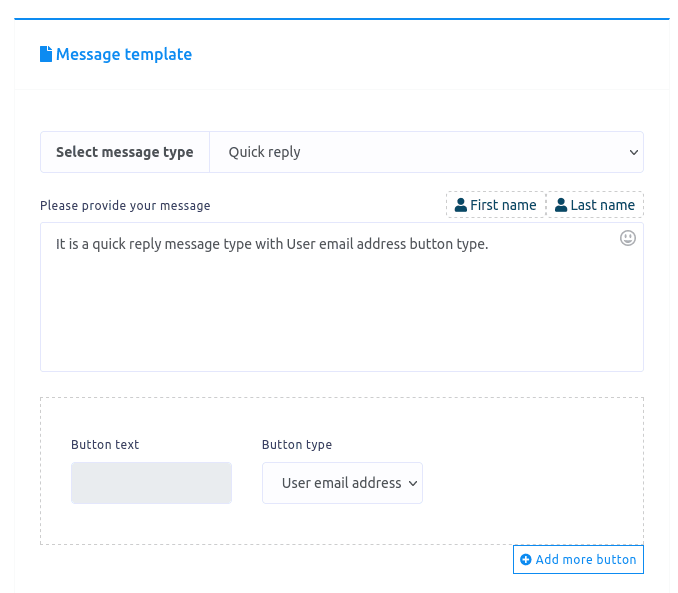 In the quick reply message type, you can select the user email address as the button type. Just as you select the User email address as the button type the Button text field will be disabled.