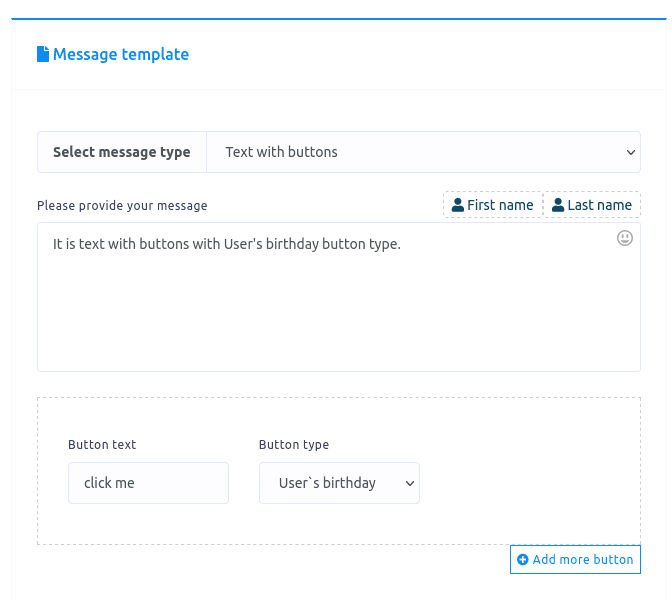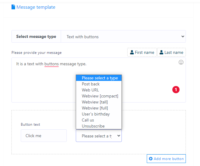 If you select Text with buttons as a reply type, some fields — Message, Button text and Button type — will appear. Write a message in the message field, write a text for button in the Button text field and select a button type from the button type field. Click on the button type field and a drop-down menu of different button types – postback, weburl, Webview(full), Webview(tall), Webview(compact), User’s birthday, Call us, Unsubscribe – will appear.