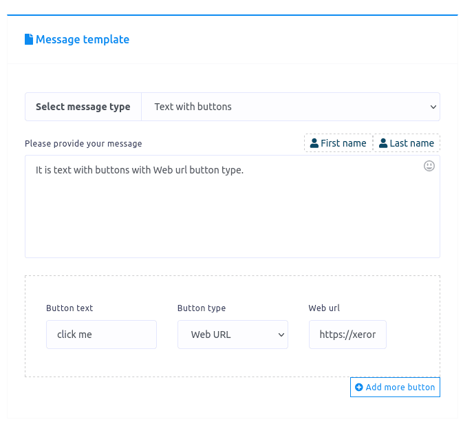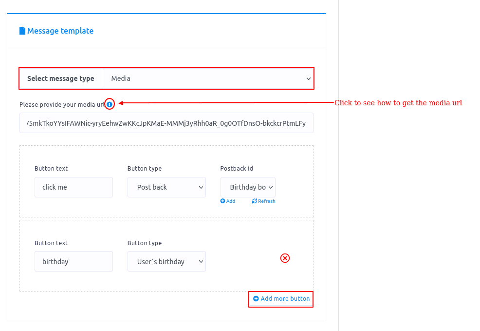 If you select Media as the message type, some fields – media url, button text and button type – will appear. Now you have to fill-out these fields. Click on the tooltip to see how to get the media url. You can add more buttons by clicking on the button called Add more button.