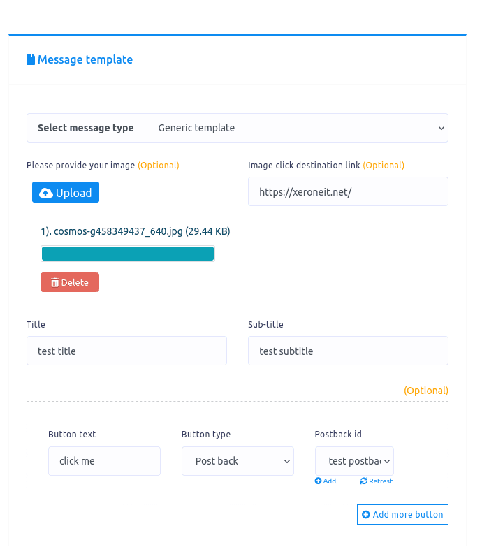 If you select Generic template as message type, an upload button and some additional fields will appear. Upload an image by clicking on the upload button. Then paste a link in the image click destination link field. When a user clicks on the image, he or she will be redirected to the link.