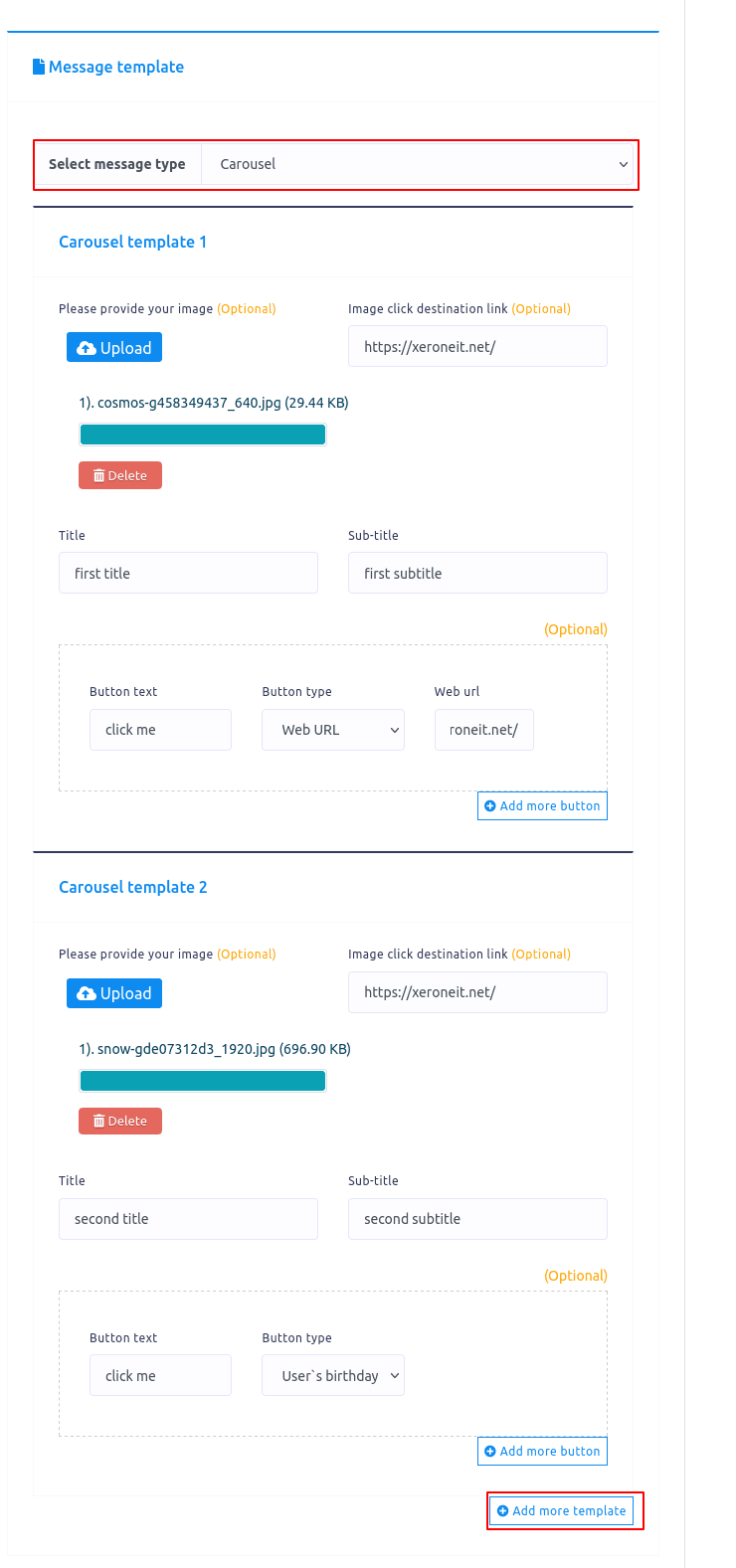 Below the fields, you will see an Add More button and an Add More Template button that will allow you to insert more buttons or templates respectively. To make a carousel, you need at least two templates.