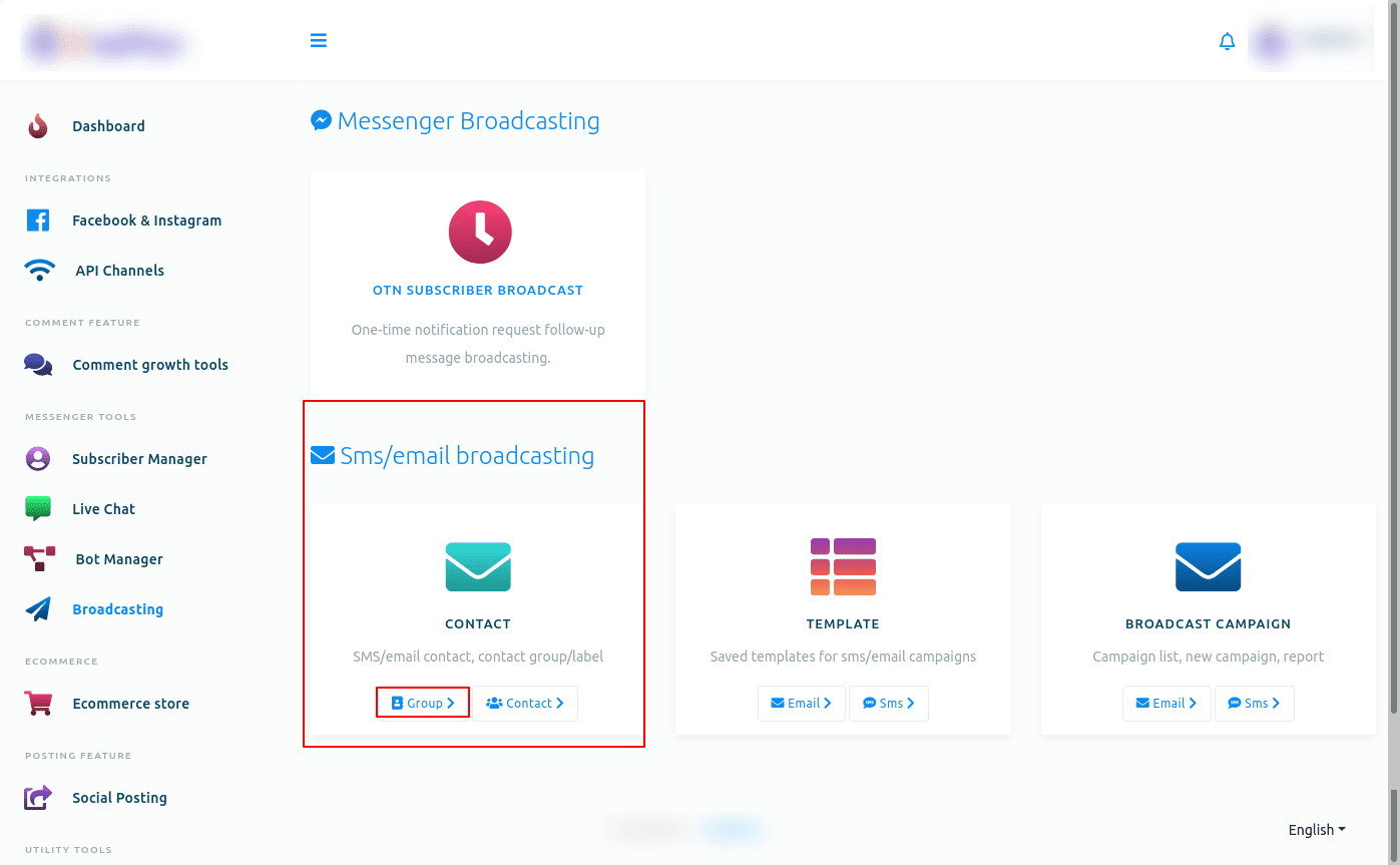 1.- Go to the Broadcasting settings. To create a Group, open the app. On the left sidebar, select Boradcasting. Click on the Group button on the Contact option of the SMS/Email broadcasting section.