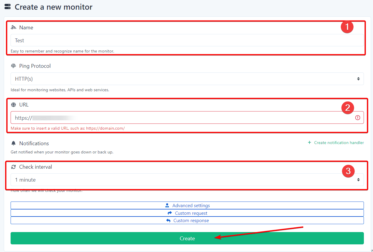 The following screen will load where you’ll need to enter a name for the monitor (1), the URL (2), the check interval (3), and finally click on ‘Create’.