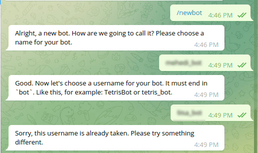 If the username you chose is taken, BotFather will ask you to try a different one.