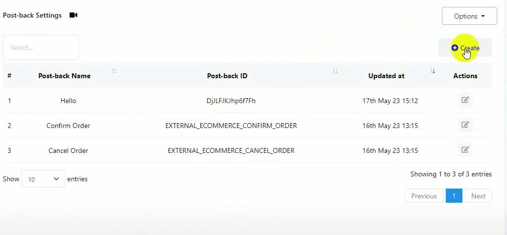Click on the Create button to create a new postback.