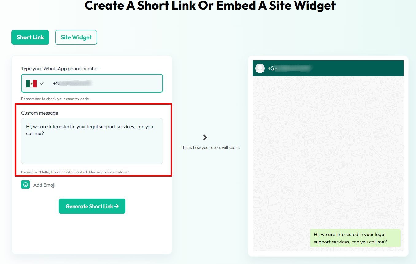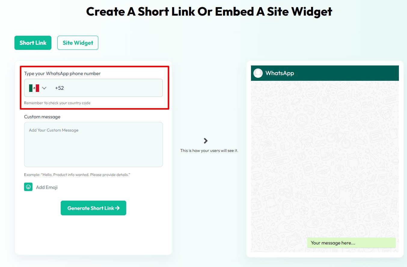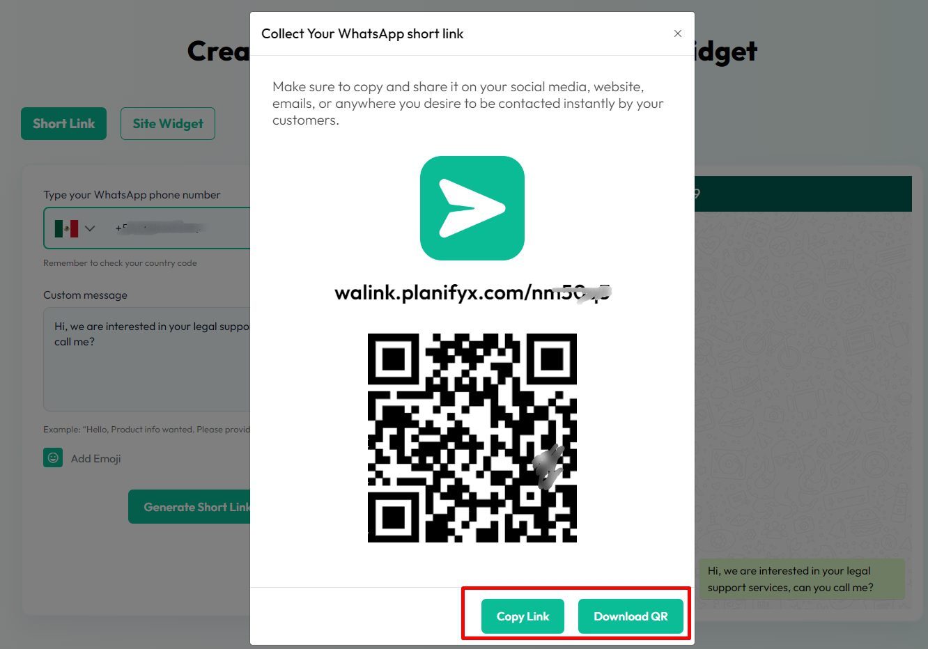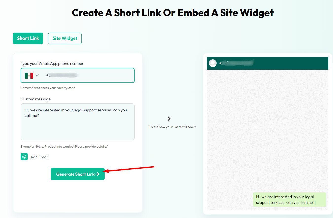 Once you have entered your phone number and composed the message, click on the “Generate Short Link” button to generate the short link and QR code.