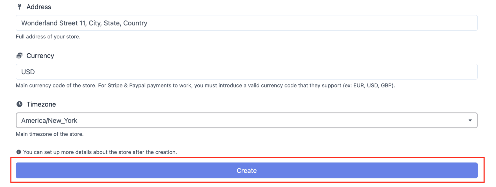 4. Add an address, currency and timezone. When you are ready, click on ‘Create’.
