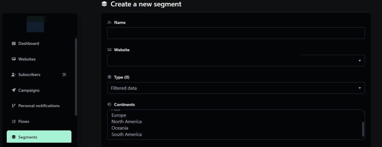 4. Fill in the requested information. “Segment name, Website where it will be created, Type, Continents, Countrys, Cities, Device, Operating systems, Browsers, Browser Languages”.