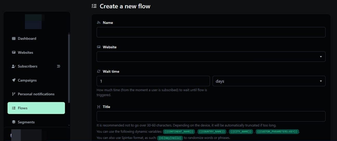 4. Fill in the requested information. “Name, Website where it will be created, Title, Description, URL, Images, Segments”. There is also an additional section called ‘Wait Time,’ where you can select the duration the app will wait after a user subscribes before sending the notification flow.