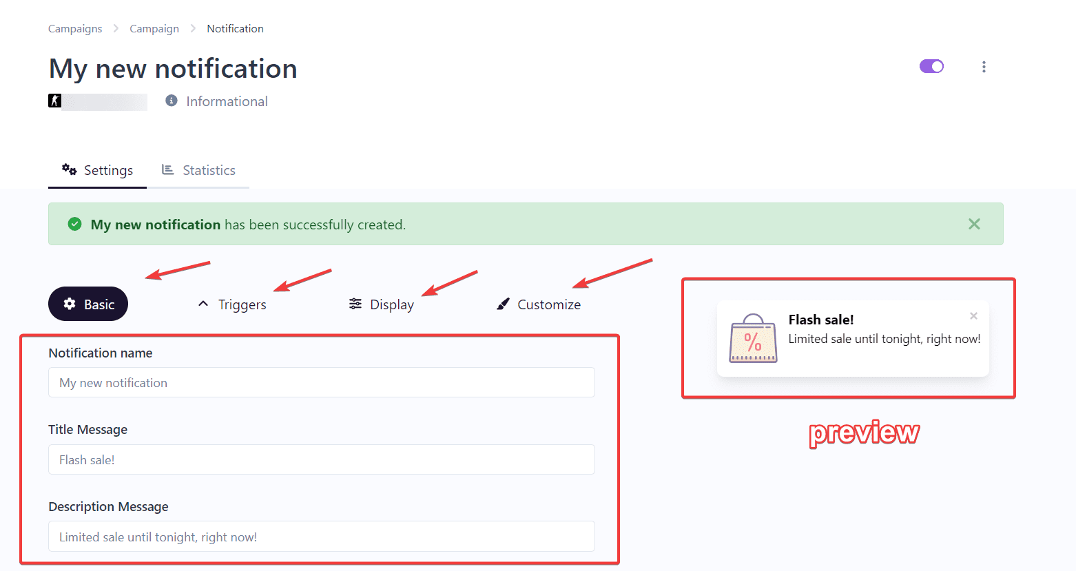3.- When you finish customizing your notification, activate it. This step is needed to start displaying it on your website.