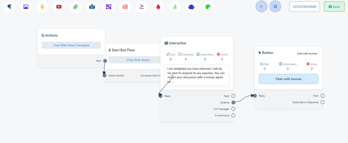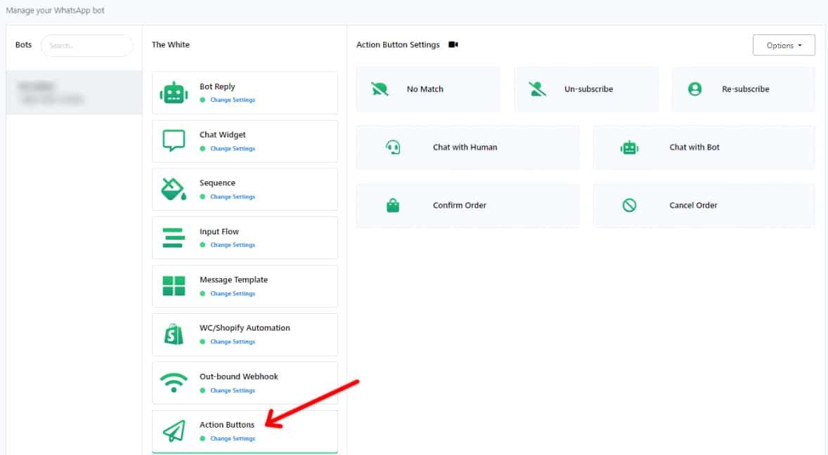 The Action Button section in the WhatsApp Bot Manager provides a range of customizable elements that dictate the bot’s basic behavior and responses. Here’s a breakdown of these action buttons and how to tailor them to your needs.