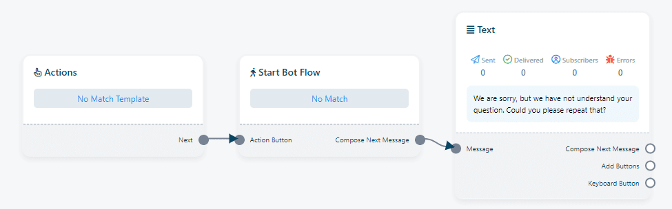 Customize the bot’s response for situations where it encounters user input it cannot understand. Click on No Match to personalize the bot’s reply to such instances. You can also put the AI Assistant here to handle those queries. Learn how here.