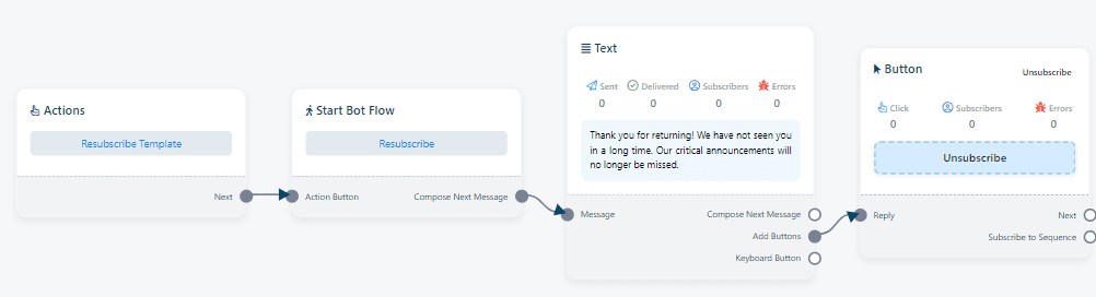 Allow users to opt back in or resume their interaction with the bot after unsubscribing. Important for sustaining user engagement and flexibility.