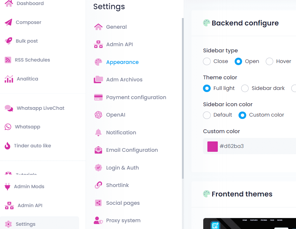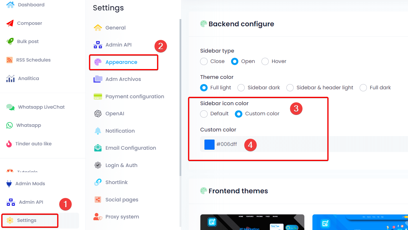 To change the platform’s colors, first, click on Settings (1) and then on Appearance (2). Within the Sidebar icon color option, you should select Custom color (3), and below, you can choose the color you prefer for your platform (4).