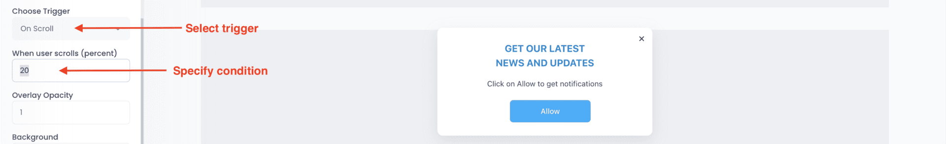 Set the opt-in trigger. Determine when the opt-in box appears by selecting a trigger: