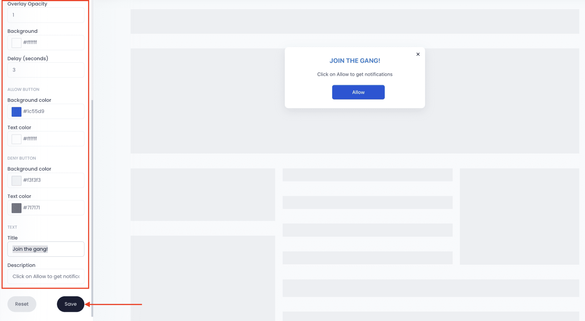 Save or reset changes. Click Save to apply your modifications. If needed, use the Reset button to restore the default design.