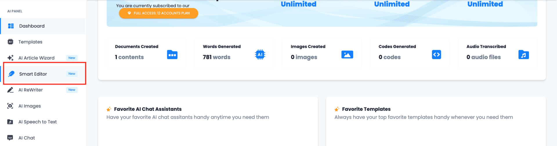 1.- Access the Smart Editor. The Smart Editor includes a vast suite of AI tools for successful text edition. To access it, open your app and on the left sidebar, click on ‘Smart Editor’.