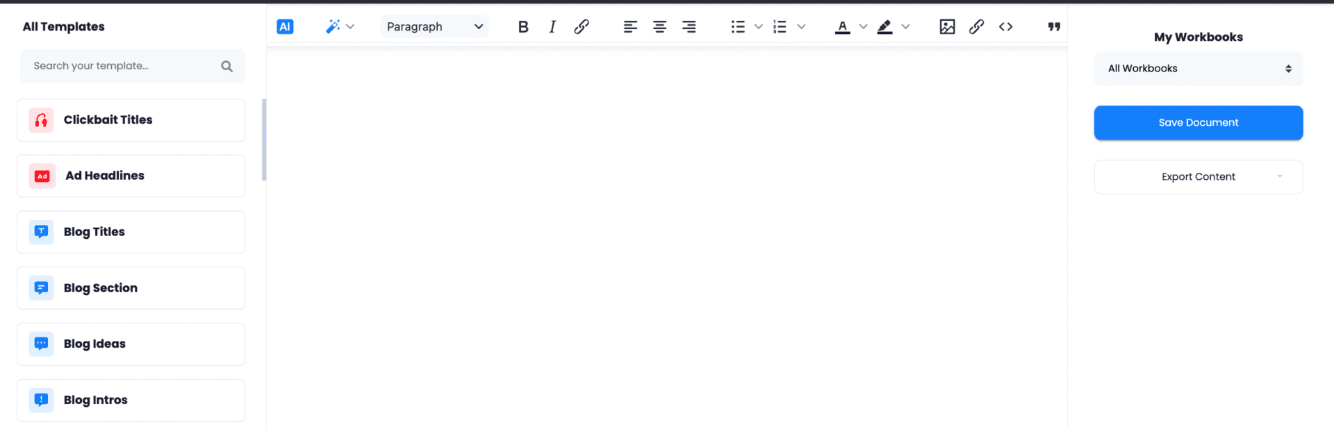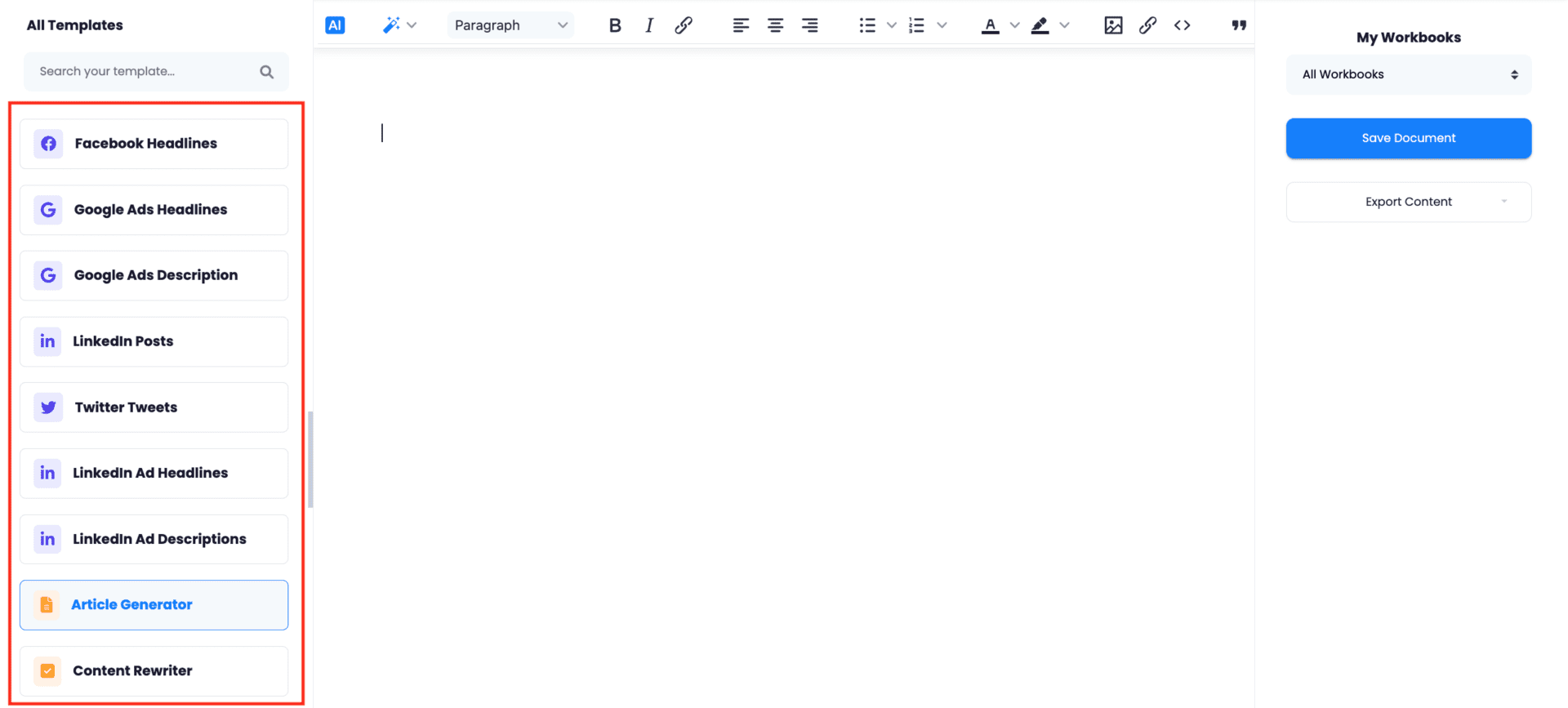 2.- Import or generate a text. To import a text, just paste it into the editor. You can also generate one with AI by selecting a prompt template from the list on the left.