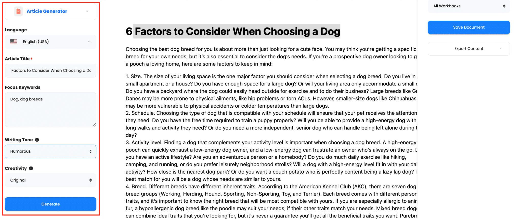 Indicate the desired language for your text. Give it a title and indicate the focus keywords for SEO purposes. Determine the writing tone, and the level of creativity, meaning how original or conservative must the AI can get. When you are done, click on ‘Generate’.